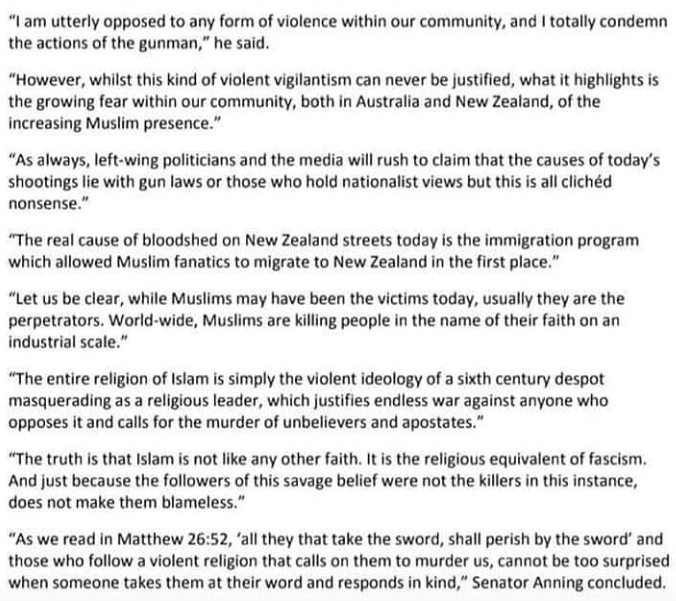statement by senator fraser anning on 15th march 2019 in response to the mosque shootings